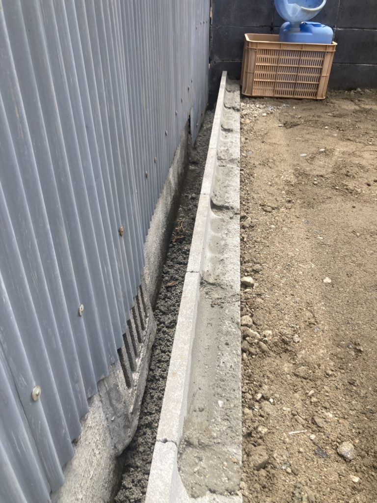 今回の現場では、隣地の建物との境目に土留めのブロックを設けました。