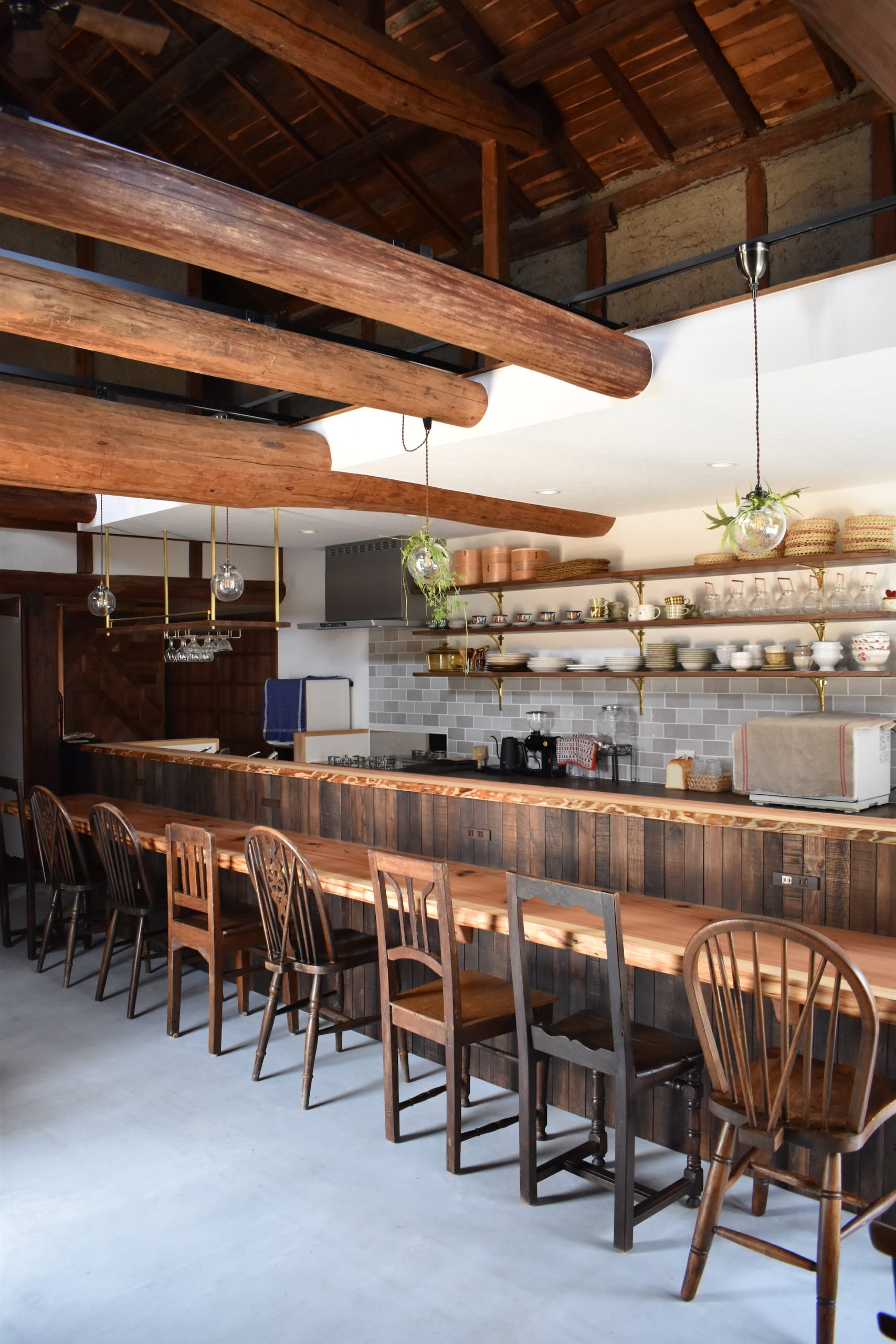 ・施主様こだわりのアンティークチェアがずらりと並ぶ、長いカウンター席。(写真2枚目)